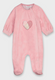 Velour footie for newborn baby girl. Baby neck. Back snap closure. Snap button fastening at crotch for easy dressing. Decorative elements: decorative applique, embroidery.