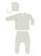 Three piece set for baby.Long sleeved T-shirt for baby. Round neckline. Snap-button fastening on the front. The item has a unisex design which offers great versatility through its neutral color tones and shape.Pants with leg warmers. Elastic waistband. Decorative elements: embroidery, Print. Patterned design.Sweet newborn hat. Patterned design.